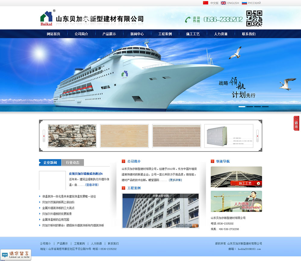 山東貝加爾新型建材有限公司,創(chuàng)建于2012年,是中國外墻保溫裝飾行業(yè)的新星企業(yè)。公司前身俄羅斯海達公司成立于2006年,主要生產彩鋼瓦,是中國最早入駐俄羅斯的生產型企業(yè)。一直以來,我們始終致力于高品質、高性能建材產品的技術創(chuàng)新,注重采用國際先進裝備為廣大客戶生產優(yōu)質的產品。我們一直關注國內裝飾保溫一體板的技術導向及市場需求,經過多年的技術研發(fā)和對國內外尖端設備的考察考核,“貝加爾墻板”已經成功面世?!柏惣訝枆Π濉睒I(yè)已通過了國家質檢部門的質量檢驗,政府準發(fā)了全國節(jié)能產品推廣證書,并獲得了多項由國家專利局頒發(fā)的實用新型專利證書,擁有歐洲CE認證和俄羅斯質量防火認證。短短的時間內,該產品大量出口俄羅斯、中亞、韓國、蒙古、伊拉克、維多利亞等地區(qū),在國內已經擁有多處樣板工程。