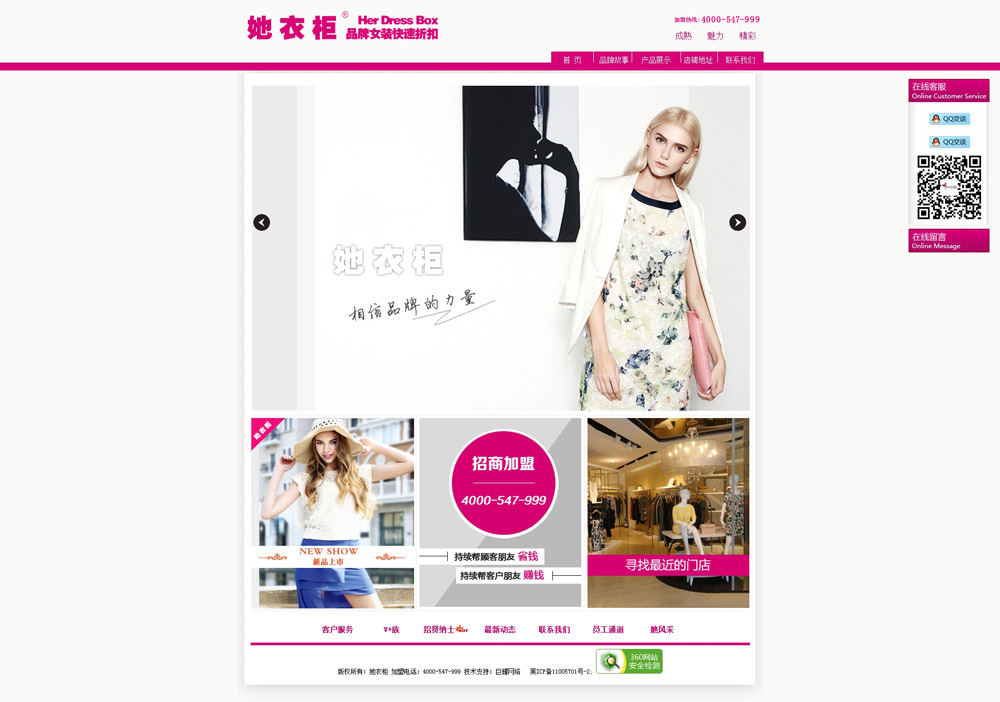 公司旗下有“三份優(yōu)依”,“衣宴”,“她衣柜”和“她衣庫(kù)”四個(gè)店鋪品牌。經(jīng)過(guò)近十年的務(wù)實(shí)發(fā)展,已經(jīng)在全國(guó)開(kāi)設(shè)直營(yíng)家170余家,加盟店260余家,而且每天都在持續(xù)增長(zhǎng)中,“她衣柜”目前已經(jīng)成為中國(guó)本土折扣行業(yè)最強(qiáng)、最大的品牌女裝折扣連鎖中心,我們有著遠(yuǎn)大的目標(biāo):致力于打造雙百(100億、100年)企業(yè)是“她衣柜”不懈的追求。